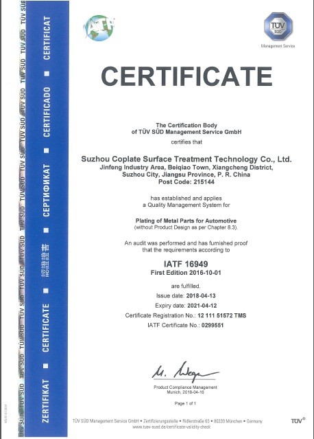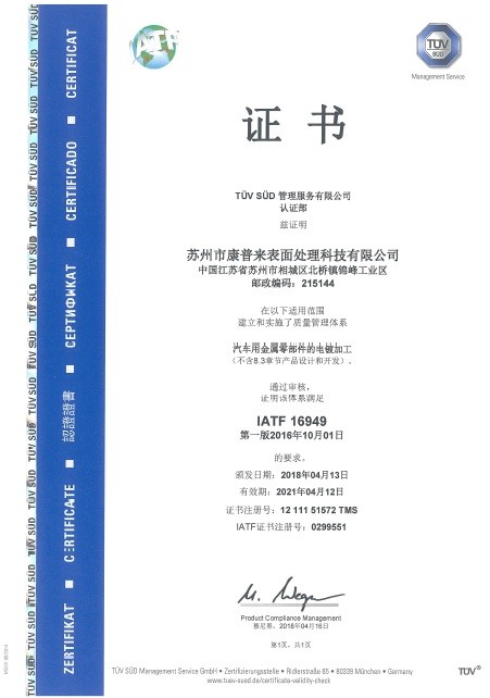 苏州市康普来表面处理科技有限公司是一家专业的表面处理加工及技术服务企业,前身为吴县市塑料电镀有限公司,苏州地区十佳表面处理企业之一,苏州市表面处理协会会员单位。 康普来现有五大事业部及一家全资子公司,分别位于苏州市的相城区和吴中区,厂房面积25000 平方米,固定资产6000万元人民币,员工近500人。 康普来具备表面处理综合加工能力,可提供不同基材上镀金、镀银、镀铜、镀镍、镀锡、 镀三元合金、喷粉、化学成膜等工艺,拥有滚镀、挂镀、连续电镀等生产线配套通讯零件、电子与汽车等产品的表面处理。并且已获得ISO9001质量管理体系、ISO14001环境管理体系、TS16949质量管理体系的资格认证。 公司拥有德国Fischer X-Ray膜厚测试仪、精密烘箱、盐水喷雾试验箱、恒温恒湿试验箱、高低温试验箱、原子吸收光谱分析仪、紫外可见分光光度计等精密测量仪器,可极大程度地保证将最符合客户要求的最优产品提供给客户。康普来一直以最专业的态度做最专业的表面处理。